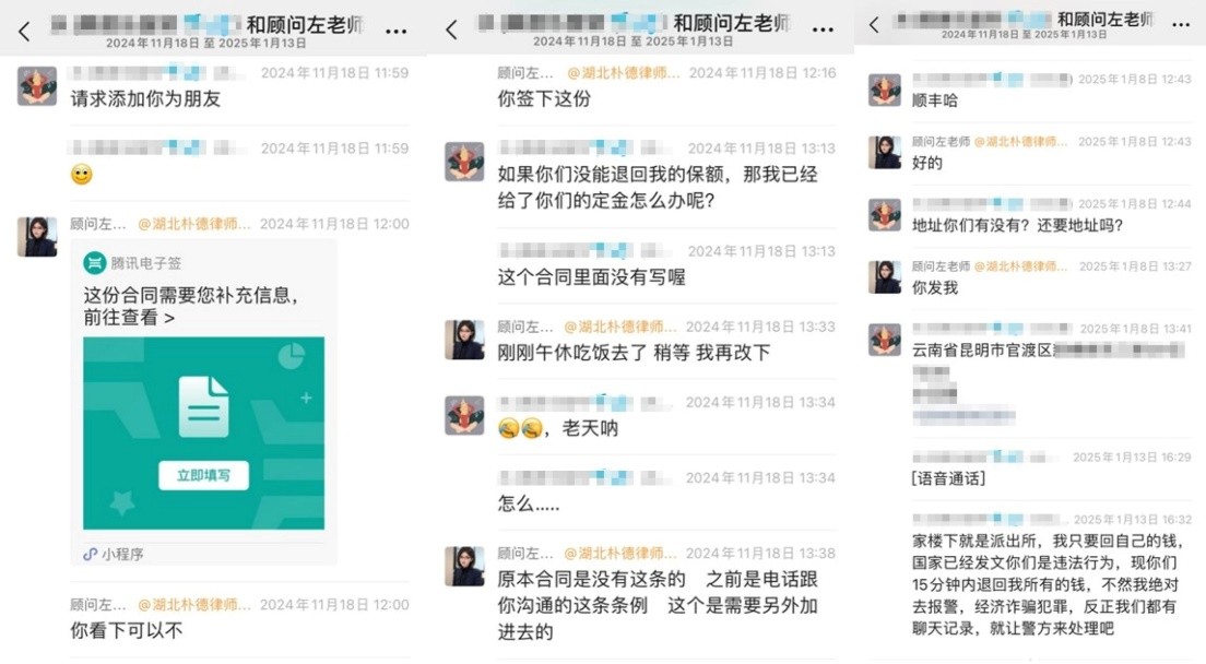 2024年12月,江西客戶S女士在網(wǎng)上看到一則“代理退?!钡膹V告,聲稱“全額退保,不成功不收費(fèi)”。因當(dāng)時(shí)經(jīng)濟(jì)壓力較大,并且缺乏對(duì)黑產(chǎn)中介的了解,S女士接觸了該所謂的“專(zhuān)業(yè)代理機(jī)構(gòu)”。在對(duì)方的誘導(dǎo)下,客戶以“銷(xiāo)售誤導(dǎo)”等虛假理由投訴保險(xiǎn)公司,要求全額退保,同時(shí)還向?qū)Ψ街Ц读?800元作為“定金”。然而后續(xù)幾天,S女士始終沒(méi)有等到對(duì)方的消息。