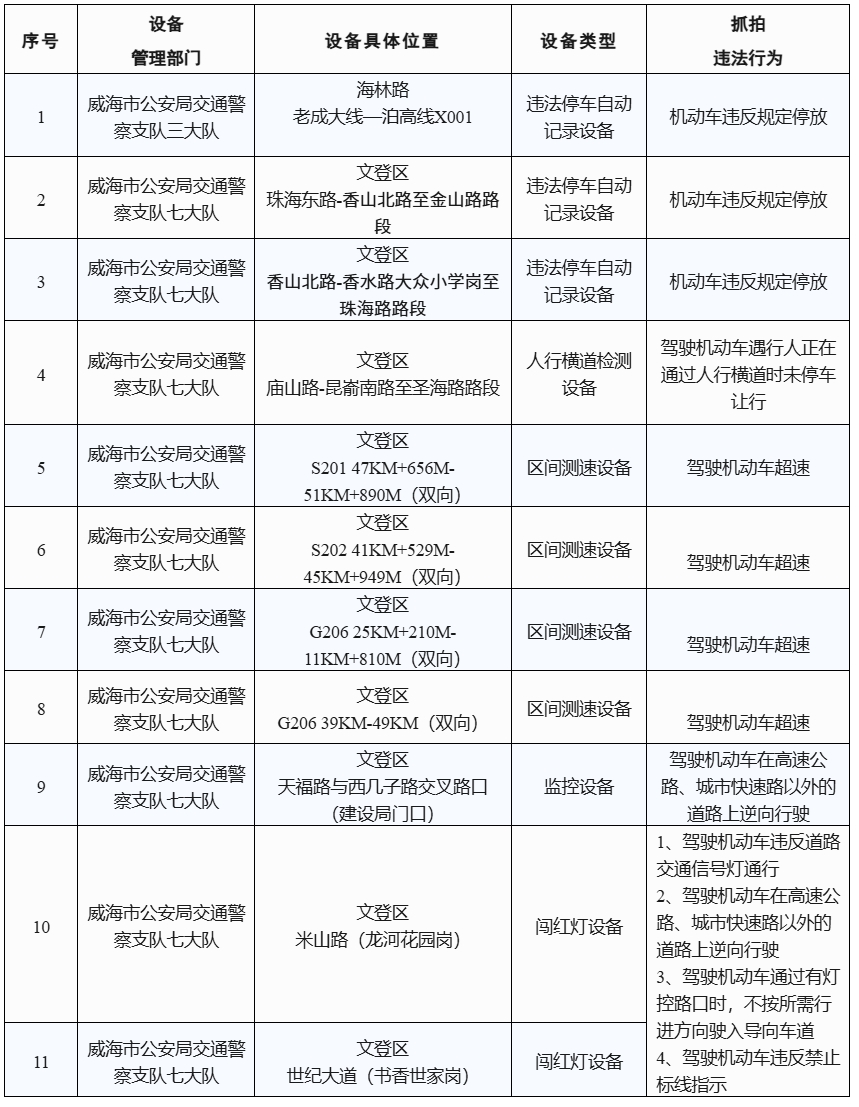 為有效預(yù)防和減少交通事故,確保道路交通安全、有序、暢通,根據(jù)《中華人民共和國(guó)道路交通安全法》及其實(shí)施條例等法律法規(guī)和相關(guān)技術(shù)規(guī)范的規(guī)定,依據(jù)《公安機(jī)關(guān)執(zhí)法公開(kāi)規(guī)定》,現(xiàn)將新增11處15個(gè)交通技術(shù)監(jiān)控設(shè)備予以公示,自10月20日起,將對(duì)有關(guān)交通違法行為進(jìn)行依法管理,請(qǐng)廣大交通參與者自覺(jué)遵守道路交通法律法規(guī),共同維護(hù)良好的道路交通秩序。