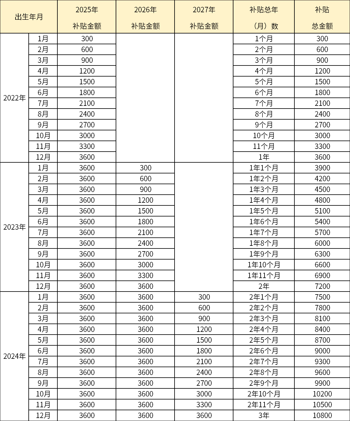 (1)對(duì)于2025年1月1日及以后出生的嬰幼兒,可連續(xù)申領(lǐng)3年補(bǔ)貼,共計(jì)10800元。