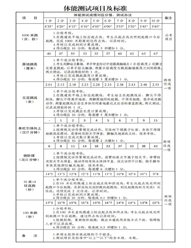 01體能、體型測(cè)試:標(biāo)準(zhǔn)參照《國(guó)家綜合性消防救援隊(duì)伍消防員招錄體能測(cè)試、崗位適應(yīng)性測(cè)試項(xiàng)目及標(biāo)準(zhǔn)》執(zhí)行??己隧?xiàng)目為:1000米跑必考項(xiàng);原地跳高、立定跳遠(yuǎn),兩項(xiàng)選一項(xiàng);單杠引體向上、俯臥撐,兩項(xiàng)選一項(xiàng);10米×4往返跑、100米跑兩項(xiàng)選一項(xiàng)。主要考察招收對(duì)象肌肉力量、肌肉耐力和爆發(fā)力等。